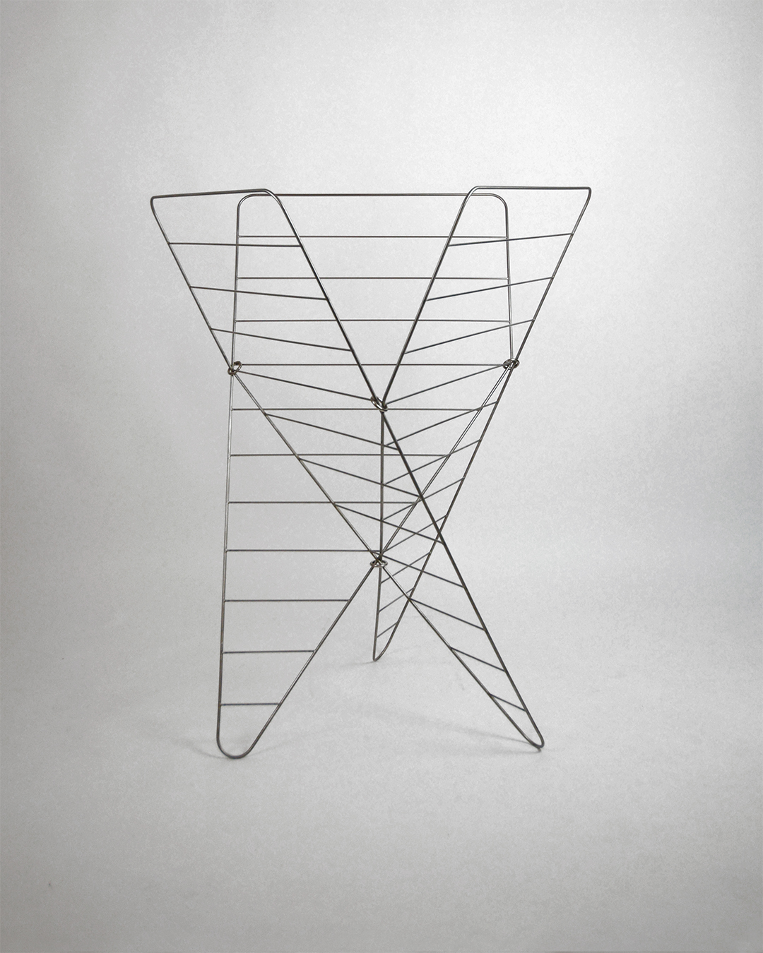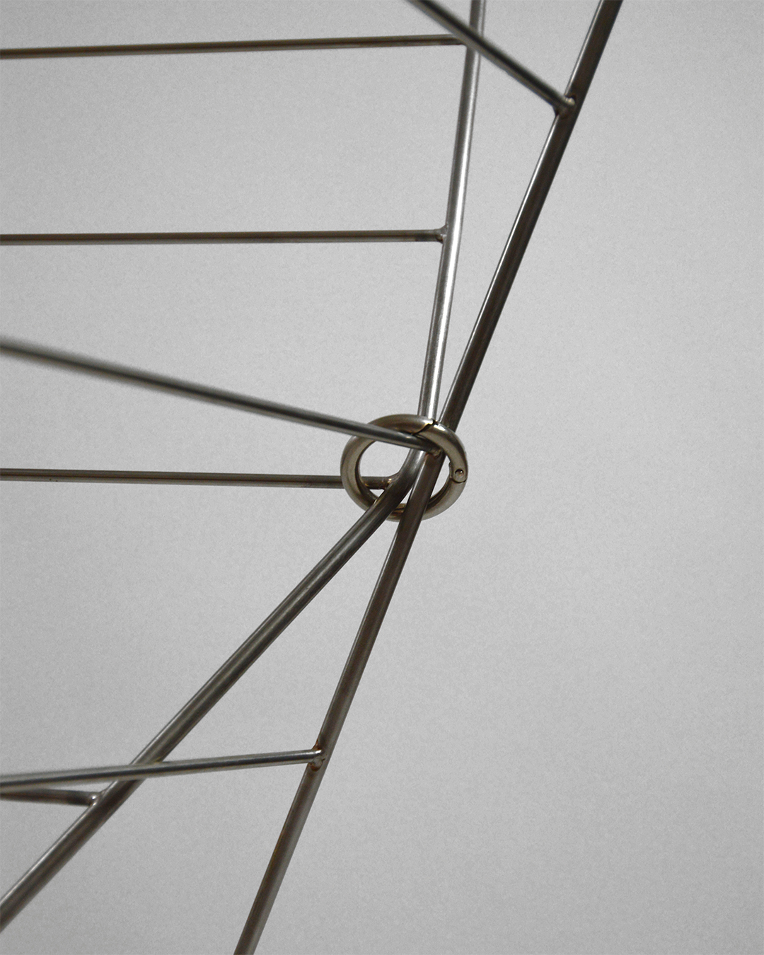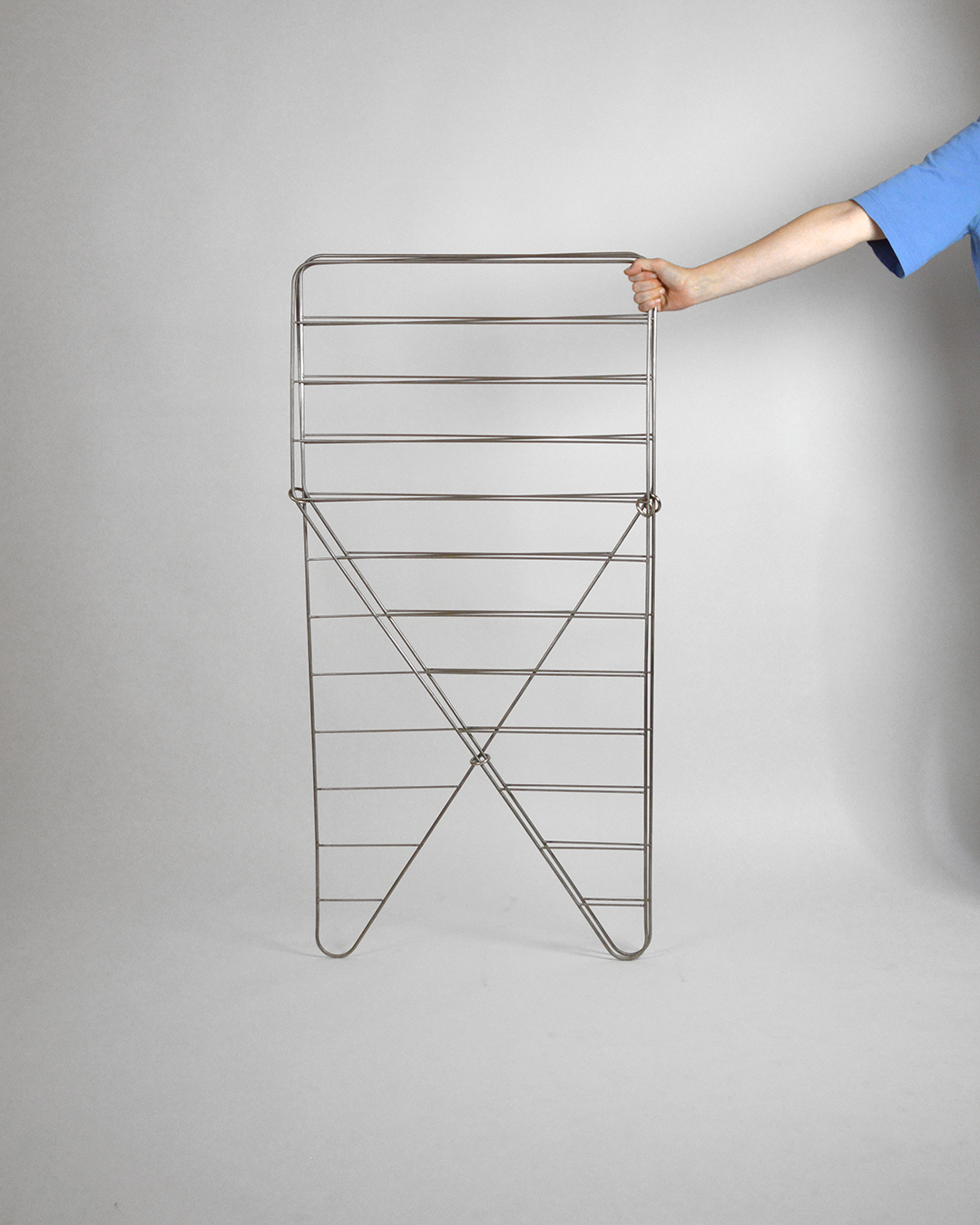A sculptural presence, standing gracefully even when not in use. Folds with a single gesture and carries the weight of a 6 kg wash (33 meters of clothes). Handmade in Belgium by Lucien Van den Berge. Designed by Eve Wolfs.